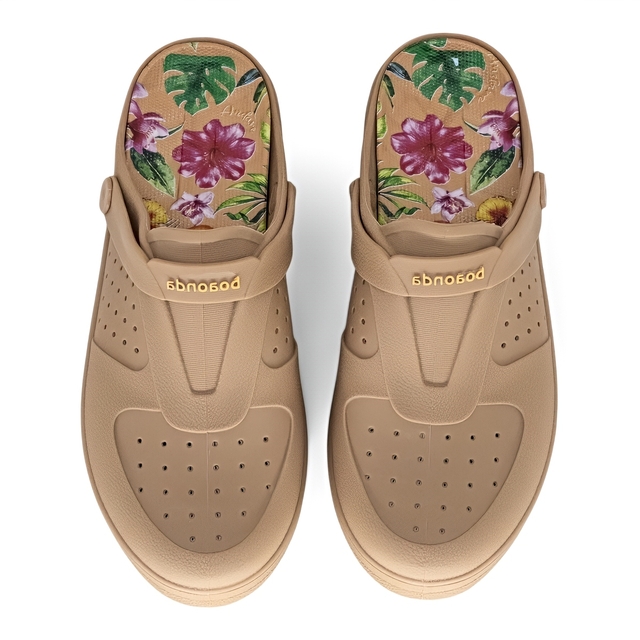 Possui formato anatômico, com formato que se modela aos mais diferentes tipos de pés, respiros laterais, alça auxiliar e flexível.