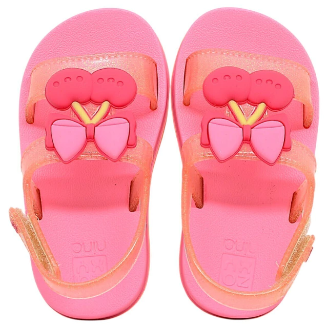 CABEDAL: Tiras em material sintético translúcido com glitter e aplique de laços e cerejinhas divertidas